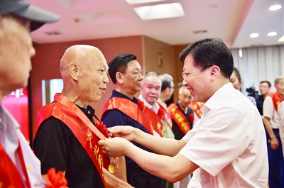 ①7月1日上午,省检察院党组书记、检察长叶晓颖为古东法等10名老党员代表颁发了“光荣在党50年”纪念章,党组副书记、副检察长卢乐云献花。图|唐龙海