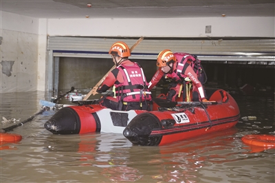 近日来,郑州天气放晴,河流水位已恢复如常,增援队伍的主要工作是排涝、清淤、消杀等。据了解,目前郑州市区还有部分小区的地下车库被洪水淹没,这些小区停水停电,严重影响居民日常生活。根据省消防救援总队统一安排,邵阳支队增援力量负责为郑东新区碧桂园天琴湾小区地下车库排涝。该小区地下车库两层,1739个车位,面积约12万平方米,因南侧车库入口地势低,在洪峰出现时,整个车库被水灌满,注水量达40万立方米。从7月23日到现在,邵阳支队一台排涝车昼夜不间断工作,所有力量分3班值守,目前累积排涝48小时,共排出水量约7.2万立方米。