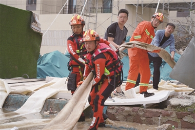 在战斗的同时,支队增援力量组建了临时党支部,书记郭强率队在碧桂园天琴湾住宅小区排涝现场重温入党誓词,开展谈心谈话,组织学习《抗洪救灾行动手册》和“八个严禁”“八个不准”。