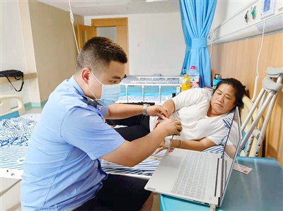 8月15日,新晃侗族自治县龙溪派出所辅警陶艺特意前往新晃县中医院,为正在住院还未采集指纹的老百姓上门服务。病床上的杨阿姨多日前身份证便已到期,但因为身体不适一直未能前往派出所更新证件信息。陶艺的上门服务为她解决了难题,杨阿姨不禁感叹:现在民警的服务真的贴心。
