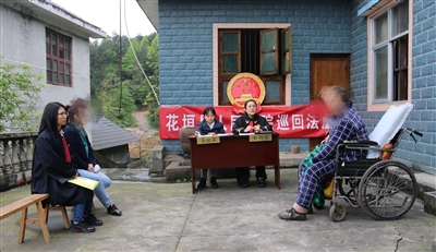 人民法庭不仅承担审判工作,也是行走的法律、法典。在宪法日等重要节点,在村部、街头,经常看到人民法庭干警的身影,他们开展疫情防控、保障农民工工资、“守护花蕾·防止性侵”法治宣讲……在调解阳某某与黄某某离婚一案时,干警从村部借来1张桌子、4把长条凳,加上头上的国徽,就搭成了简易的审判庭,边城法庭干警向当事人解释法条、法律,向村部干部、村民以案说法,营造了“有话好好说,有事依法办”的和谐氛围。