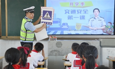 9月2日,交警在为小学生讲解交通标识和交通安全知识。新学期开学,江永县公安局交警大队联合辖区内多所中小学,开展“开学第一课交通安全进校园”活动。为学生普及交通安全知识,培养孩子们的交通安全意识和安全防护能力。