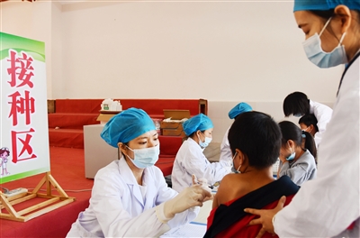 10月26日,江永县第三小学,学生在接种新冠病毒疫苗。当天,该县组织3岁至11岁学生,分批次在各幼儿园、各学校开始新冠病毒疫苗接种,筑牢校园疫情防控“安全线”。