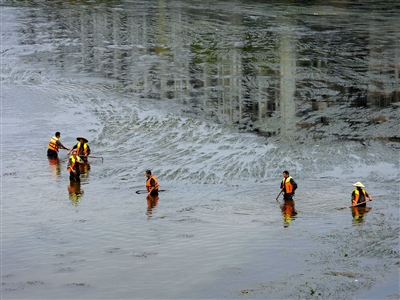 11月6日,通道侗族自治县双江镇,工人在河道清除水中杂草,保障水流顺畅洁净。