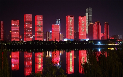 11月25日晚,长沙湘江两岸上演主题灯光秀,多个地标建筑披上红装,流光溢彩,庆祝中国共产党湖南省第十二次代表大会召开。