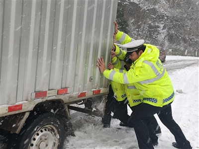 近日,堡子镇小水山路段道路积雪结冰,一辆货车发生侧滑困于山路崖边,会同县公安局交警大队四中队民辅警立即紧急施救,通过车拉人推的方式使被困车辆成功脱险。通讯员 王礼丽