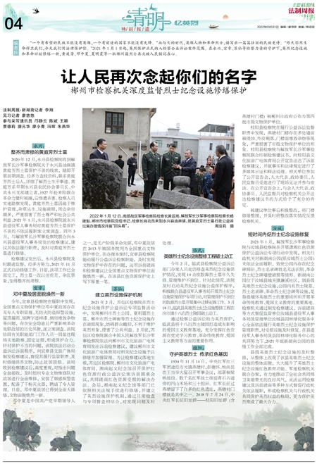 “一个有希望的民族不能没有英雄,一个有前途的国家不能没有先锋。”血与火的时代,英雄人物和革命烈士,谱写出一篇篇壮丽的民族史诗。“昨天你用生命捍卫我们,今天我们用法律保护你。”2021年1月1日起,英烈保护正式纳入检察公益诉讼案件范围。在永兴、宜章、苏仙等检察力量的守护下,英烈纪念设施和革命旧址修缮一新,黄庭芳、邓中夏、夏明震等一批郴州籍烈士再次被人民铭记在心。