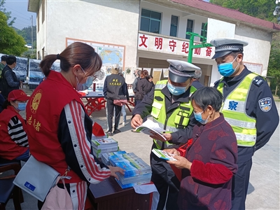 4月21日上午,新晃侗族自治县公安局交管中心组织民警随县文化科技卫生“三下乡”队伍走进辖区鱼市镇新桥村,为广大群众送安全。活动中,民警通过设立咨询台、面对面讲解交通安全常识、发放交通安全宣传海报、挂图、手册,送温馨提示等,引导广大群众遵守交通规则,安全文明出行。