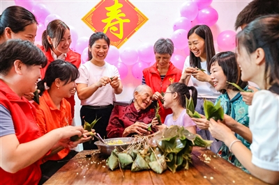 5月30日,临武县舜峰镇金盆村,102岁老人文双月与志愿者一起包粽子。当天,该县志愿者带着蛋糕、慰问品等来到老人家中,庆贺老人寿辰,迎接端午佳节。
