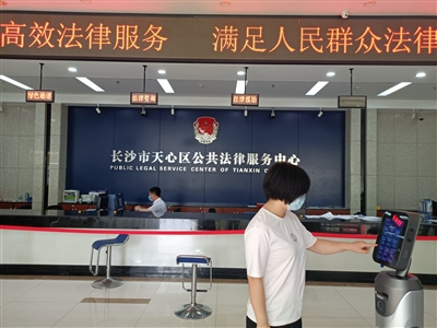 “小法,我要去哪申请行政复议?”来到天心区公共法律服务中心,只要找到大厅门口负责接待的智能机器人“小法”,它就会移动将当事人带到大厅行政复议窗口前面。