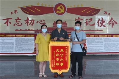 本报讯(通讯员 林叶)7月12日上午,一面写着“秉公办事 无私奉献”的锦旗送到了永州市零陵区法院副院长、法官郭庆的手中。当事人刘某某将锦旗赠送给承办法官郭庆时,按捺不住激动的心情,连连道谢。