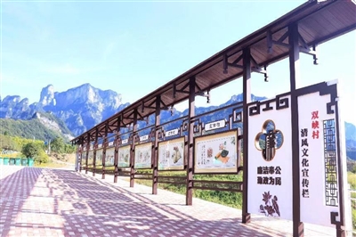 以村部为中心着重打造的清廉文化广场,充分结合了张家界绝美山水风貌、当地家风家训文化,通过大量的水墨墙绘展现出一幅幅秀丽的乡村廉洁文化画卷。
