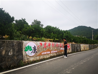 “全民携手联动,创享清风岩冲——岩冲村欢迎您”。岩冲村,位于龙山县南端,为里耶镇所辖,是该县清廉乡村建设示范点之一。以勤廉家风文化为主基调,打造进村道路宣传路牌、廉政文化宣传墙、清廉活动室等“1路1墙1室”的清廉景观,与漫山遍野的脐橙树一道,构成一幅美丽的清廉乡村图画。