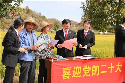 金秋时节,新田县人民法院前往乡村振兴结对村,开展“喜迎党的二十大 护航乡村振兴”普法活动。他们用群众喜闻乐见的方式,通俗易懂的语言,引导村民做好疫情防控、森林防火、安全收割等重要事务。图为10月11日,法官在田间地头为当地村民分发普法资料,解读法律法规。