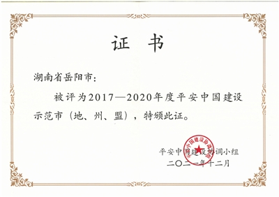 近年来,岳阳不断提升平安建设社会化、法治化、智能化、专业化水平,平安建设水平稳居全省前列。2017年,岳阳被评为“全国社会治安综合治理优秀市”,2021年,荣获平安建设的最高奖项“平安中国建设示范市”,2019至2021年,连续被评为“全省综治工作先进市”,2016至2019年,连续4年获评“中国最具幸福感城市”,“平安岳阳”已成为岳阳城市最靓丽的一张名片。