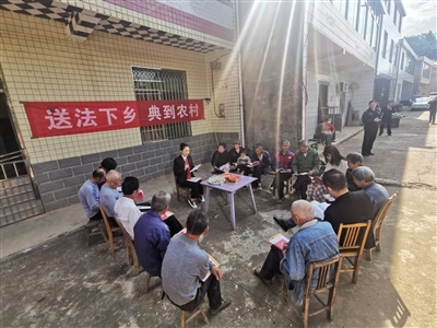 11月10日上午,衡东县人民法院干警在杨桥镇温泉新村一农家屋场开展送法下乡活动。干警通过发放普法书籍、以案说法、现场咨询等方式,切实让当地老百姓感受到法治光芒可以照耀幸福生活。图为新塘人民法庭庭长刘芬芬现场宣讲《民法典》之婚姻家庭编。通讯员 刘尚球