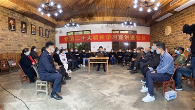 “听了安志接地气的宣讲,让我对党的二十大报告里很多和我们老百姓息息相关的政策有了更深地理解。”牌楼坝村党员代表邓利华深有感触。11月14日下午,党的二十大代表、长沙市公安局高新区分局雷锋派出所所长安志来到雷锋街道牌楼坝村,宣讲党的二十大精神,宣讲以“屋场会”的形式进行。图为安志和牌楼坝村的党员代表、群众代表面对面畅谈交流。
