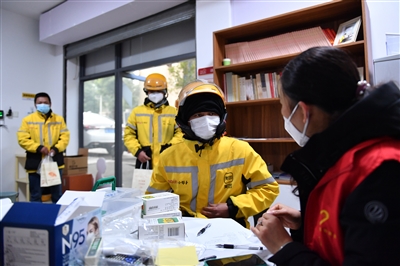 日前,长沙市在全市129个新就业群体“红色之家”设置“共享药箱”,免费为快递员、外卖骑手、货车司机等户外劳动者发放止痛片、化痰药等药品。图为12月29日,在长沙市天心区文源街道天鸿社区的“红色之家”,外卖骑手排队领取药品。