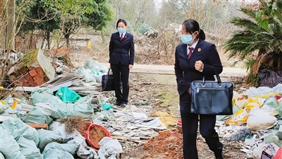 2022年12月29日,长沙市望城区检察院接到线索,在辖区内某生态湿地公园旁长期存在随意倾倒建筑垃圾、生活垃圾的现象,严重影响了当地居民的生活环境。图为检察干警现场查看核实情况,并向当地街道办发出检察建议,要求其清除该宗土地上的建筑垃圾和生活垃圾,恢复土地原貌,组织恢复新绿,切实保护好土地资源。