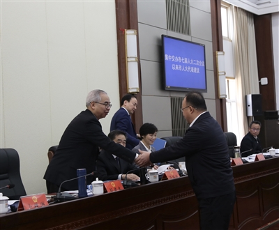 2月27日,市七届人大常委会第九次会议集中交办市七届人大二次会议以来的市人大代表建议。图为市人大常委会党组书记、主任彭建忠(左)将代表建议目录交到市委常委、常务副市长刘勇会(右)手中。