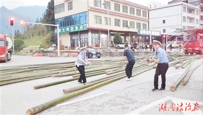 4月4日,一辆装载毛竹行驶的货车,因装载不牢固,运输途中散落在公路上,一度造成交通拥堵。蓝山县公安局交通管理大队民警及时赶赴现场,清理货物。经过两个小时的搬运,数百根毛竹全部被搬至路边,交通恢复正常。图为交警搬运毛竹现场。