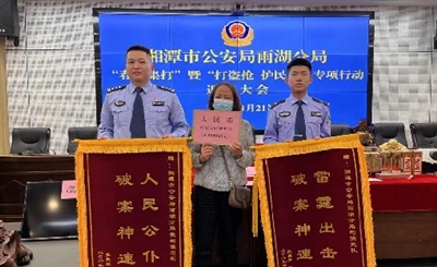 本报讯(通讯员 肖洋桂 蒋懿)“幸亏公安及时破案,抓到小偷,追回赃款。不然,我一家10多口人,今后怎么生活!”4月21日湘潭市公安局雨湖分局举行的“春季集打”暨“打盗抢 护民安”专项行动返赃大会上,市民张女士从办案民警手上接过20多万元现金和1条金项链,无比激动。