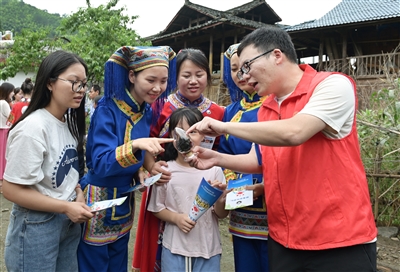 8月3日,洞口县罗溪瑶族乡大麻溪村,禁毒志愿者向群众讲解毒品的危害。连日来,该县公安民警、禁毒志愿者深入到少数民族乡村开展禁毒宣传活动,广泛传播“健康人生、绿色无毒”理念,增强群众识毒、拒毒、防毒意识。