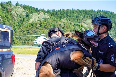9月19日,长沙市公安局特巡警支队今年第1批选拔出的3名警犬训导队员,经过1周以上的携犬理论培训、飞行体验、平地索降等科目训练后,开展空中携犬索降训练。