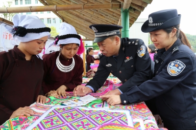 4月17日,来自湘桂黔3省区边界的侗、苗、瑶等少数民族群众与全国游客齐聚通道侗族自治县牙屯堡镇,参加湘桂黔原生态大戊梁歌会。图为大戊梁歌会上,通道公安局经侦民警向少数民族群众普及经侦法律法规和防范非法集资、养老诈骗等安全知识。