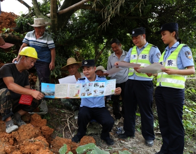 近日,怀化铁路公安处怀化火车站派出所组织民警深入管内沿线,向群众开展爱车护路宣传。民警与护路队员一道,对重点路段进行巡视,加强铁路设施设备的检查。图为民警发现附近群众在铁路边施工挖土的情况,及时上前做好安全宣传工作。