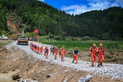 7月30日,资兴市八面山瑶族乡,武警第二机动总队经过两天昼夜奋战,通过砂石垫底、铺设涵管等方式,建起一条临时通道桥,让救援人员和大型救援装备通过。图为救援人员通过抢通的坪田桥前往救援。