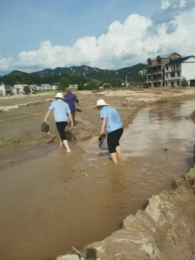 8月14日,记者踏着泥泞来到现场。只见帮扶工作队员挥汗如雨,现场指挥,并协助清除淤泥。