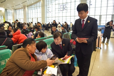 2月13日,正值春运返程高峰,为保障铁路安全畅通和旅客平安出行,衡阳铁路运输检察院组织党员干警在衡阳东高铁站开展“路路通达 平安出行”主题志愿服务,通过换乘引导、法律咨询、普法宣传等多元服务,零距离护航群众出行安全。