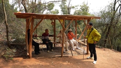 他还在一路上修建了不少简易休息凳,在半山腰修建了一座简易凉亭,亭子里面和周围写了一些自创金句:“文明是美德,比帅哥美女更美!”“你扔垃圾是享受,别人上来是难受。”平时干完活,老人都会带走一些垃圾。