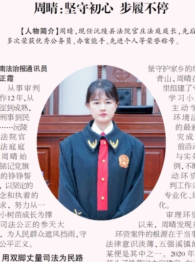 “我也没有什么耀眼的成绩,我只是想着每一件案子都要办得再好一点、再细一点。”周晴说,在往后的漫长岁月里,她将继续以勤勉书写对司法事业的悠长热爱。