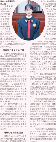 “在生态文明建设的道路上,需要人民群众的共同参与。因此普法宣传是实现这一目标的关键环节。”作为“法润辰州”普法宣讲团的成员,周晴积极参与环资法律知识的普及与宣传,通过送法进校园、巡回法庭进乡村、法庭开放日以及拍摄法治微电影等多种宣传形式,向社会公众传播生态文明理念,营造全民保护生态环境的良好氛围。