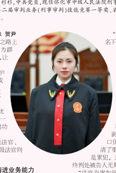 【人物简介】向杉杉,中共党员,现任怀化市中级人民法院刑事审判一庭二级法官,先后荣获湖南省第二届审判业务(刑事审判)技能竞赛一等奖、省五一劳动奖章、省巾帼建功标兵等荣誉。