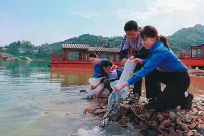 近日,古丈县检察院青年干警携手罗依溪小学师生代表,前往罗依溪酉水河码头开展增殖放流护生态实践活动,青年干警以实际行动践行环保理念,守护绿水青山,将生态保护的法治课堂延伸至实践一线。图为干警带领学生投放鱼苗。