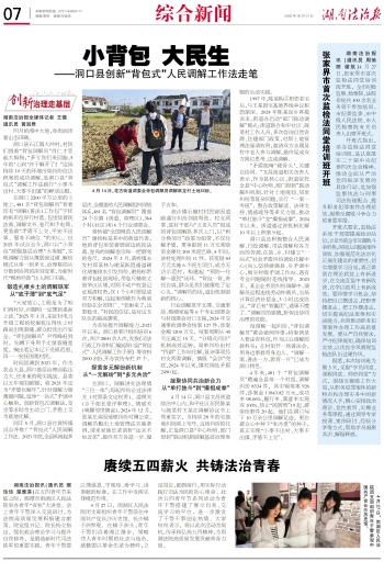 同年5月,洞口县在黄桥镇试点并推广“背包式”人民调解工作法。2021年底,全县构筑起多层次、全覆盖的人民调解组织网络体系,481名“背包调解员”覆盖24个乡镇(街道、管理区)、364个村(社区)和6个行业调委会。
