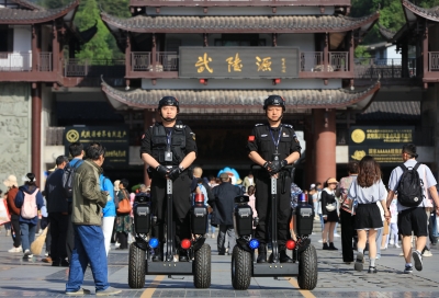 此外,张家界公安还推出智慧旅游警务平台,搭建“张家界移动警务”App,积极探索智慧巡防模式,推动静态视频监控与动态巡逻防控无缝对接,在全市景区内主要道路、重点场所、重点部位布设监控探头8000余个、语音播报系统30多套,打造了线上有卡口、面上有监控、高空有鹰眼的技防网络。