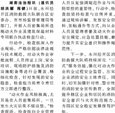 湖南法治报讯(通讯员 胡洪耀 蒋健)日前,永州经开区消防救援大队联合区安委办、市市场监督管理局等部门,开展人员密集场所违规动火作业及建筑保温材料专项联合执法检查行动。 行动中,检查组深入作业现场,严格依据法律法规与技术规范,对动火作业审批流程、人员持证上岗、安全培训、现场防护措施及消防设施配备等进行全覆盖、精细化检查,针对发现的安全隐患,检查组当场责令责任方立即进行整改。 “动火作业风险极高,尤其是在人员密集场所,一旦发生火灾后果不堪设想。”检查现场,检查组向企业管理人员反复强调规范作业与风险管控的重要性。行动中,检查组坚持检查与宣传并重,通过现场讲解、发放安全资料、张贴通告等方式,向从业人员及管理者普及动火作业安全规定、应急处置技能,着力提升其安全意识和操作规范性。 下一步,永州经开区消防救援大队将持续深化“三式”服务效能,强化对动火作业的全过程安全监管,压实企业消防安全主体责任。同时,切实加强针对性、警示性的消防安全宣传教育,全面提升辖区企业和居民的消防安全意识与火灾防范能力,为园区安全稳定发展保驾护航。 |