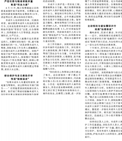 严惩犯罪与精准帮教并重 彰显“司法力度” 4月11日,桃江检察提起公诉的薛某某强奸案开庭审理,有猥亵儿童前科的薛某某被判处有期徒刑13年。消息传出后,群众纷纷拍手称快。 未成年人是国家的未来、民族的希望。面对侵害未成年人权益的犯罪行为,尤其是性侵害未成年人犯罪,该院始终坚持“零容忍”态度,在办案程序上,坚持提前介入引导侦查,依法快捕快诉,从严打击。 “涉罪未成年人就像行走在悬崖边的人。关键时刻拉他们一把,就可能拯救他们的一生。”谈及涉罪未成年人帮教,该院未检工作负责人感触颇深。在办理未成年人涉罪案件时,该院严格坚守宽严相济刑事政策,最大限度挽救涉罪未成年人。探索推行“附条件不起诉+个性化帮教”模式,将倾心帮教贯彻未成年人犯罪案件办理始终,帮助6名涉罪未成年人顺利度过考察期,重回人生正轨。 综合保护与多元救助并举 传递“检察温度” “发现未成年人有遭受性侵害、家庭暴力等情况,请立即向有关部门报告……”经常能看到该院检察官深入教育、医疗部门等密切接触未成年人岗位所在重点领域宣讲强制报告制度的活动场景。 未成年人保护是一项系统工程,需要凝聚各方力量。桃江检察积极推动未成年人保护制度落地落实,形成保护合力。督促相关单位和人员严格落实强制报告制度,去年来通过强制报告发现并干预隐患线索2条;指导县卫健局、教育局等部门开展从业查询27389人次,对有前科劣迹的督促解聘或做出处理 3人;针对家 |