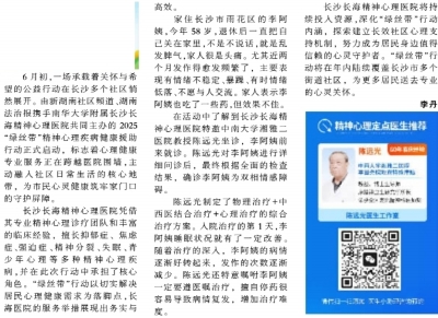 6月初,一场承载着关怀与希望的公益行动在长沙多个社区悄然展开。由新湖南社区频道、湖南法治报携手南华大学附属长沙长海精神心理医院共同主办的2025“绿丝带”精神心理疾病健康援助行动正式启动,标志着心理健康专业服务正在跨越医院围墙,主动融入社区日常生活的核心地带,为市民心灵健康筑牢家门口的守护屏障。 长沙长海精神心理医院凭借其专业精神心理诊疗团队和丰富的临床经验,擅长抑郁症、焦虑症、强迫症、精神分裂、失眠、青少年心理等多种精神心理疾病,并在此次行动中承担了核心角色。“绿丝带”行动以切实解决居民心理健康需求为落脚点,长海医院的服务举措展现出务实与高效。 家住长沙市雨花区的李阿姨,今年58岁,退休后一直把自己关在家里,不是不说话,就是乱发脾气,家人很是头痛。尤其近两个月发作得愈发频繁了,主要表现有情绪不稳定、暴躁、有时情绪低落、不愿与人交流。家人表示李阿姨也吃了一些药,但效果不佳。 在活动中了解到长沙长海精神心理医院特邀中南大学湘雅二医院教授陈远光坐诊,李阿姨前来就诊。陈远光对李阿姨进行详细问诊后,最终根据全面的检查结果,确诊李阿姨为双相情感障碍。 陈远光制定了物理治疗+中西医结合治疗+心理治疗的综合治疗方案。入院治疗的第1天,李阿姨睡眠状况就有了一定改善。随着治疗的深入,李阿姨的病情逐渐好转起来,发作的次数逐渐减少。陈远光还特意嘱咐李阿姨一定要遵医嘱治疗,擅自停药很容易导致病情复发,增加治疗难度。 长沙长海精神心理医院将持续投入资源,深化“绿丝带”行动 |