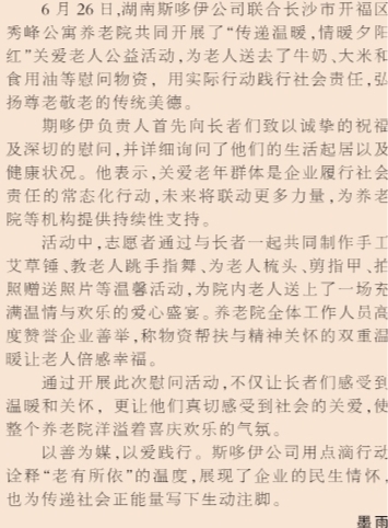 6月26日,湖南斯哆伊公司联合长沙市开福区秀峰公寓养老院共同开展了“传递温暖,情暖夕阳红”关爱老人公益活动,为老人送去了牛奶、大米和食用油等慰问物资,用实际行动践行社会责任,弘扬尊老敬老的传统美德。 期哆伊负责人首先向长者们致以诚挚的祝福及深切的慰问,并详细询问了他们的生活起居以及健康状况。他表示,关爱老年群体是企业履行社会责任的常态化行动,未来将联动更多力量,为养老院等机构提供持续性支持。 活动中,志愿者通过与长者一起共同制作手工艾草锤、教老人跳手指舞、为老人梳头、剪指甲、拍照赠送照片等温馨活动,为院内老人送上了一场充满温情与欢乐的爱心盛宴。养老院全体工作人员高度赞誉企业善举,称物资帮扶与精神关怀的双重温暖让老人倍感幸福。 通过开展此次慰问活动,不仅让长者们感受到温暖和关怀,更让他们真切感受到社会的关爱,使整个养老院洋溢着喜庆欢乐的气氛。 以善为媒,以爱践行。斯哆伊公司用点滴行动诠释“老有所依”的温度,展现了企业的民生情怀,也为传递社会正能量写下生动注脚。 墨雨 |