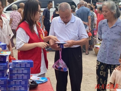 在集市中心的宣传台前,大学生志愿者向赶集的商户和群众发放《反电信网络诈骗法》《中华人民共和国未成年人保护法》《中华人民共和国民法典》和《湖南省先进制造业促进条例》等宣传资料。面对群众提出的法律疑问,志愿者熟练切换“方言频道”,把专业法律条文转化为通俗易懂的家常话,让乡亲们听得明明白白。