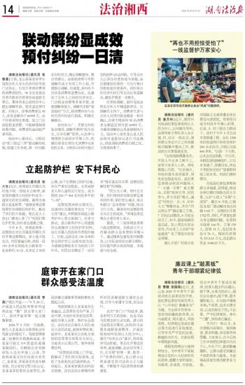 湖南法治报讯(通讯员 彭六生)近日,保靖县比耳镇比耳村他不组一段临水公路旁,新安装的镀锌立柱防护栏成为一道坚实的安全屏障,赢得当地群众连连称赞。“感谢县委巡察组帮忙协调修好防护栏,解决了我们的大难题,现在老人小孩出门都安心多了!”村民们聚在护栏旁,纷纷表达感激之情。