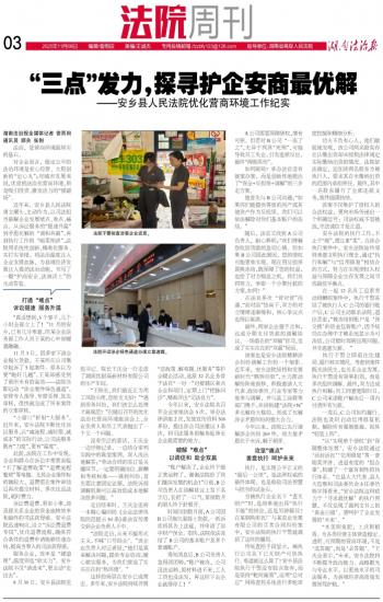 今年以来,安乡法院共召开企业家座谈会5次,举办法律讲座2次,发放宣传资料500多份,提出涉企司法建议3条次,将司法服务的触角延伸至企业最需要的地方。