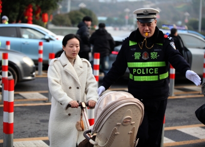 春节期间,怀化南站迎来客流高峰,日均到发旅客超5万人次。为确保秩序,怀化铁路公安处交通管理支队民警分班轮岗,在车站入口处指挥出租车、私家车有序停靠,疏导车辆日均超8000辆。针对老弱病残及行李多的旅客,民警主动上前引导,开辟绿色通道,日均步行达2万步,全力保障旅客安全顺利进站乘车。