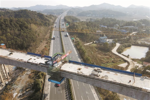 2020年12月31日,常益长铁路跨岳临高速特大桥连续梁施工现场,工人在进行最后的混凝土浇筑入槽施工。当天,由中铁十一局集团6标承建的常益长铁路全线跨度最长连续梁顺利合龙,也是全线率先完成铁路桥梁线下工程的施工标段,为后续桥面系无砟轨道施工打下了坚实的基础。 陈尚溢 摄