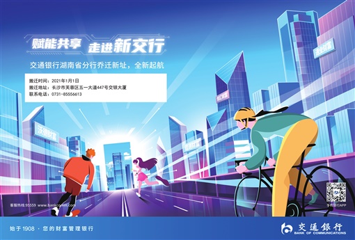 2021年1月1日,交通银行湖南省分行从韶山中路37号搬迁至芙蓉区五一大道447号交银大厦。这也是时隔20年,交通银行湖南省分行重回五一大道。
